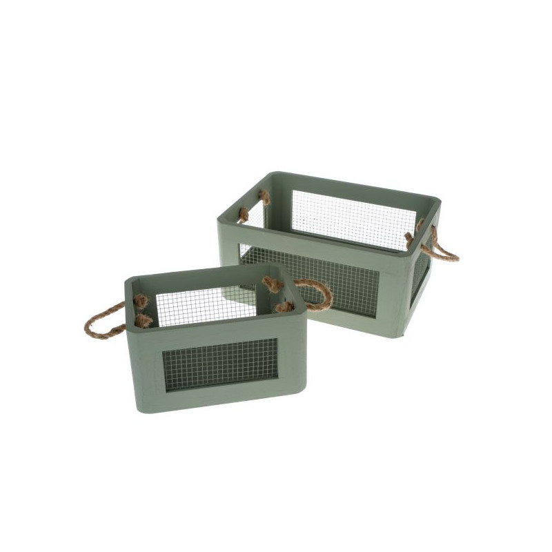 Zelená přepravka-box s jemnou mřížkou a provazovými uchy působí lehce a přirozeně. Nese v sobě klid přírody, dotek rukodělné práce a nenápadnou eleganci. Dřevo v uklidňujícím odstínu šalvěje dodává nádech lehké nostalgie letní zahrady a vybízí ke sběru voňavých bylinek.