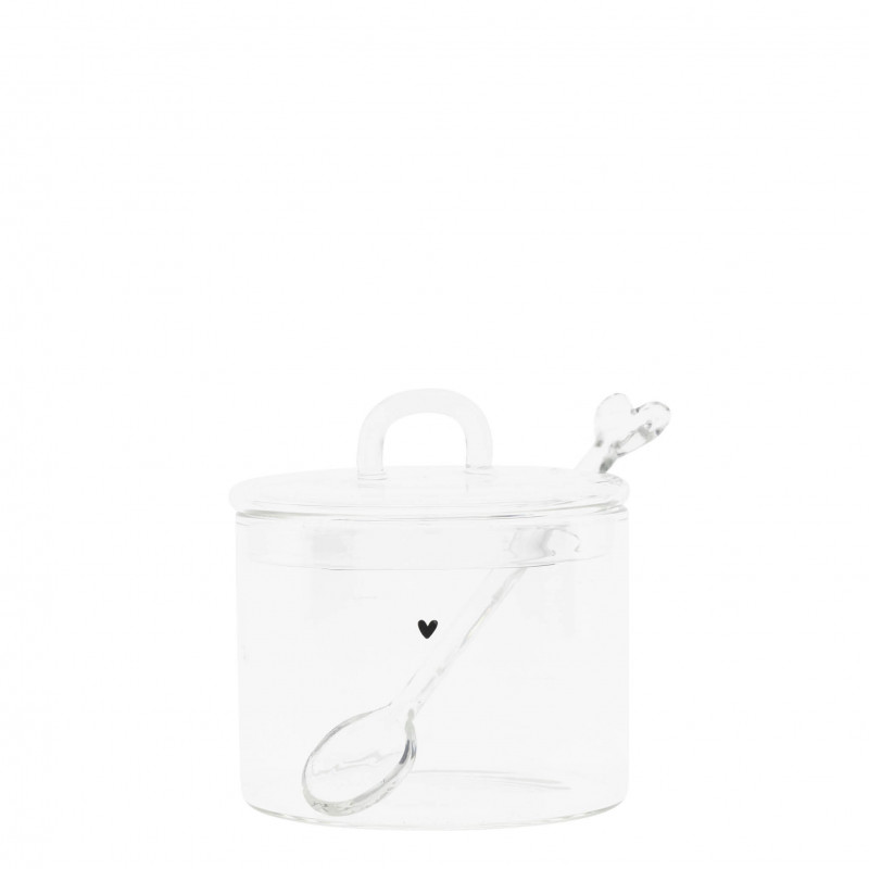 Skleněná cukřenka s jemným černým srdíčkem v detailu, jejíž čistý a elegantní tvar skvěle zapadne na romanticky prostřený stůl. Každé slazení kávy nebo čaje se s ní stane malým rituálem. Součástí cukřenky je malá skleněná lžička, která se dokonale hodí k jejímu tvaru a dělá z cukřenky praktický i dekorativní kousek.