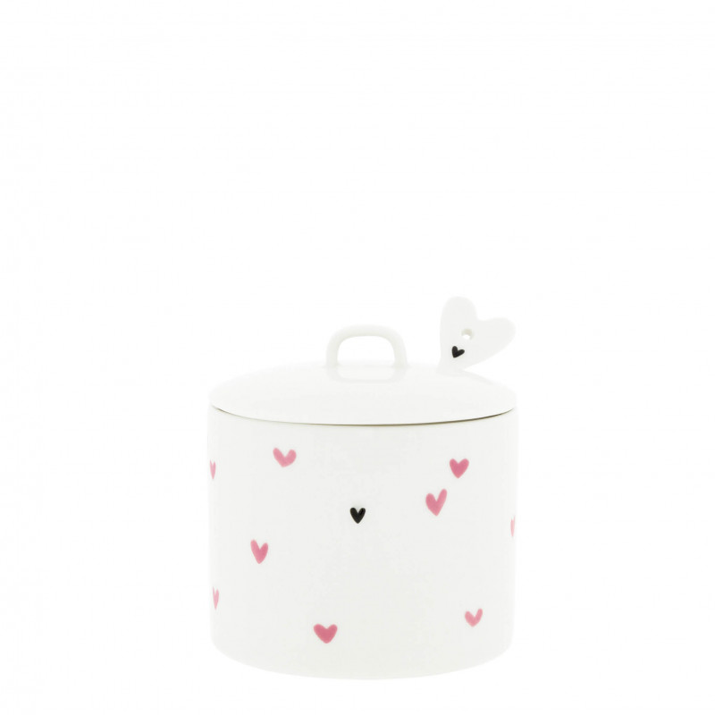 Sněhově bílá keramická cukřenka s něžnými srdíčky v růžové barvě, skvěle zapadne na romanticky prostřený stůl, do útulné kuchyně i jako drobný dárek pro někoho, kdo si potrpí na krásné detaily. Každé slazení kávy nebo čaje se s ní stane malým rituálem. Součástí cukřenky je malá keramická lžička. Z kolekce LÉTO 2026 od holandské značky Bastion Collections.