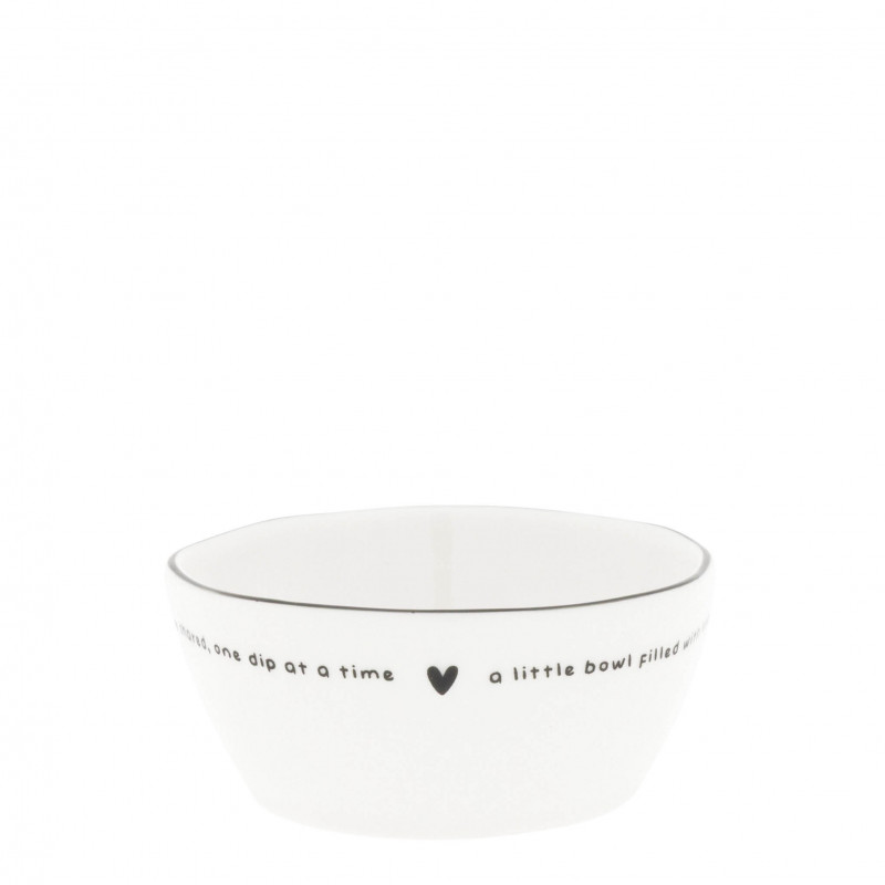 Malá keramická miska o objemu 140 ml v bílé barvě s nápisem po obvodu misky, je ideální pro servírování omáček, dipů, dresinků a jiných drobných pochutin.