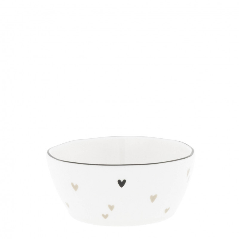 Malá keramická miska o objemu 140 ml v bílé barvě s hnědými srdíčky po obvodu misky, je ideální pro servírování omáček, dipů, dresinků a jiných drobných pochutin.