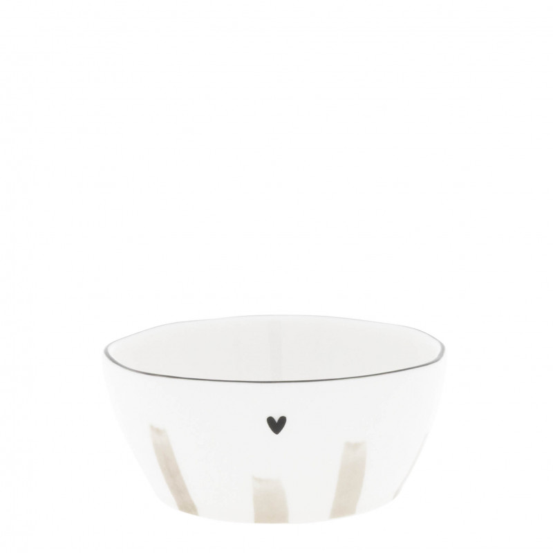 Malá keramická miska o objemu 140 ml v bílé barvě s proužky, které jsou namalovány svisle, je ideální pro servírování omáček, dipů, dresinků a jiných drobných pochutin.