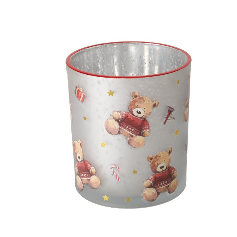 Vytvořte si doma útulnou vánoční atmosféru s tímto půvabným skleněným svícnem s motivem medvědů. Svícen je doplněn o drobný tisk s klasickými svátečními motivy. Vnitřní strana svícnu je stříbrně lesklá, takže odlesky plamene čajové svíčky se krásně rozptýlí a rozzáří celý motiv. Na horním okraji svícnu je tenká červená linka, která dodává celkovému vzhledu elegantní nádech.