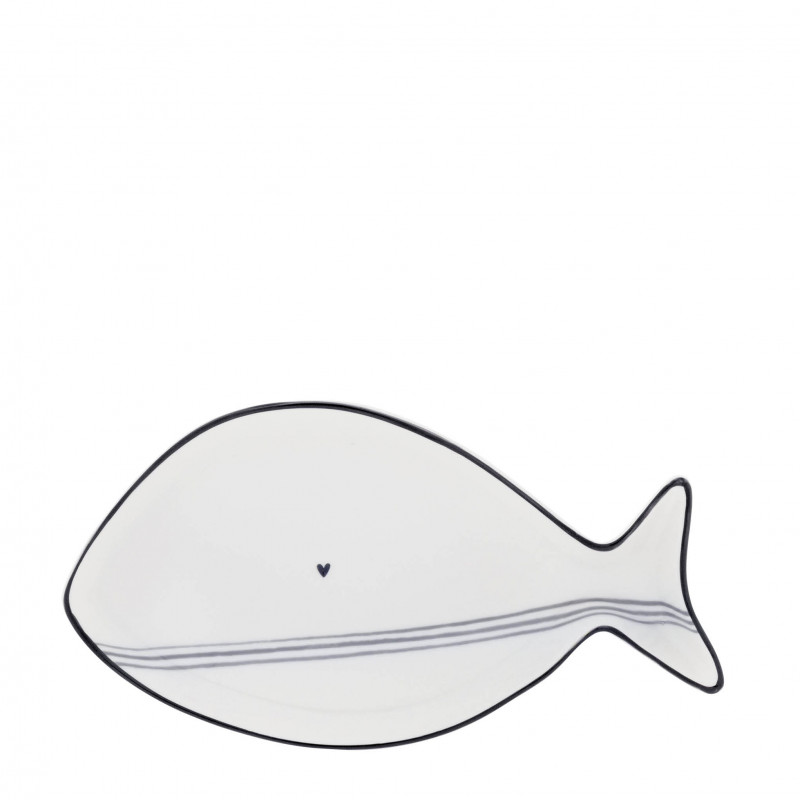 Talíř ve tvaru rybky je kousek, který rozzáří každý stůl. Uvnitř talíře se vine trojice tenkých linek v odstínu modrého akvarelu, jako by je zanechala lehká stopa moře. Decentní detail, který talíř zjemňuje a podtrhuje jeho romantický charakter. Z kolekce LÉTO 2026 značky Bastion Collections.